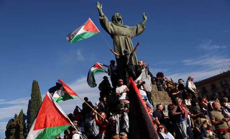 وفي برشلونة، جاب نحو 70 ألف متظاهر شوارع المدينة رافعين لافتة ضخمة كتب عليها “أوقفوا الإبادة الجماعية في فلسطين. أوقفوا تجارة الأسلحة مع إسرائيل”، وفقا لشرطة البلدية. وتقول مدريد إنه يوجد نحو خمسين إسبانيا بين الناشطين المحتجزين الذين كانوا على متن أسطول “الصمود العالمي”.