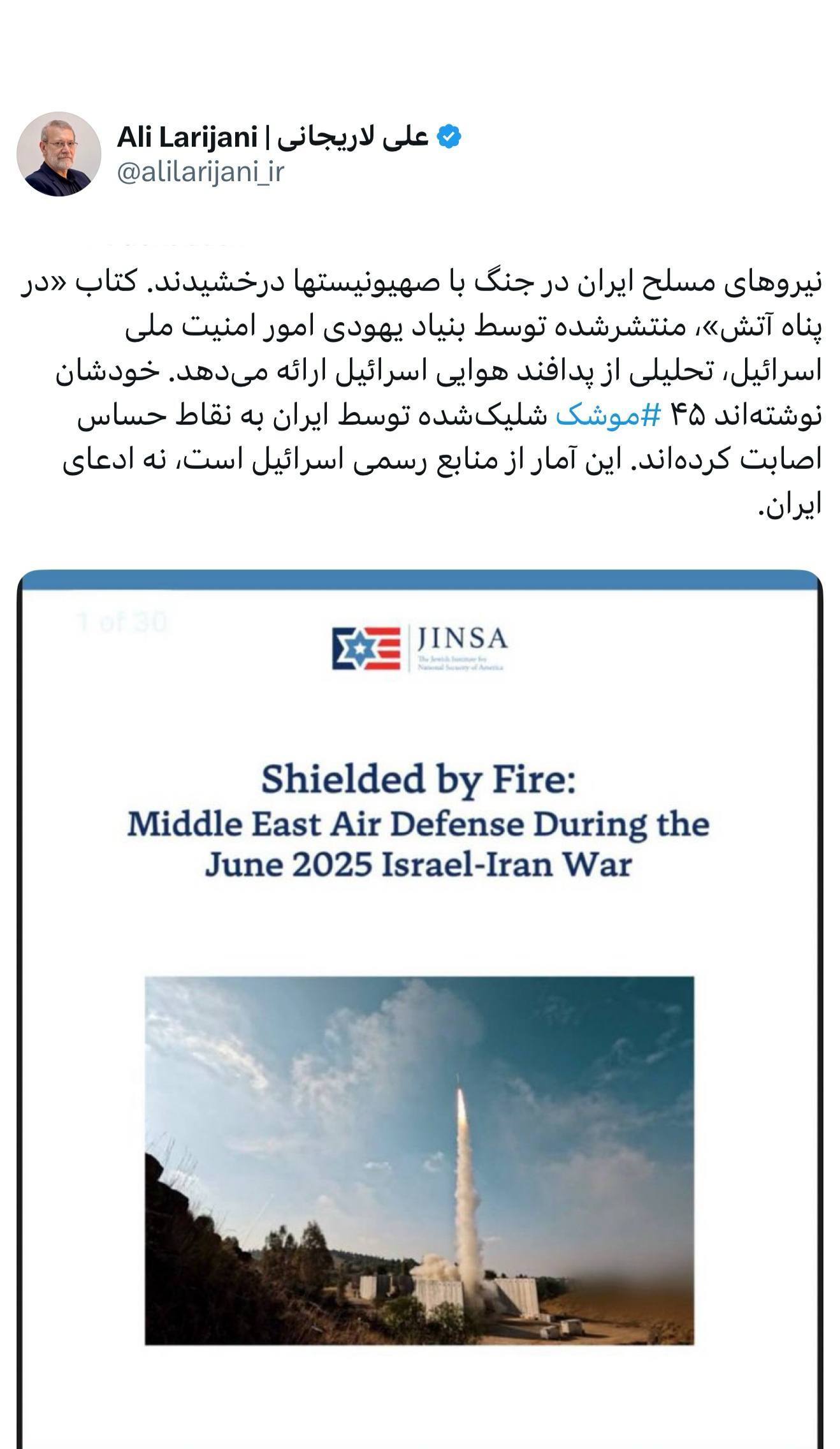 "القوات المسلحة الإيرانية تألقت في الحرب ضد الصهاينة. ان كتاب 'في ظلّ النار' الصادر عن المؤسسة اليهودية للأمن القومي الإسرائيلي، يقدم تحليلًا للدفاع الجوي الإسرائيلي. وقد ذكروا بأنفسهم أن 45 صاروخًا أُطلقت من إيران أصابت نقاطًا حساسة. هذه الإحصائية مأخوذة من مصادر إسرائيلية رسمية، وليست ادعاءً من إيران."