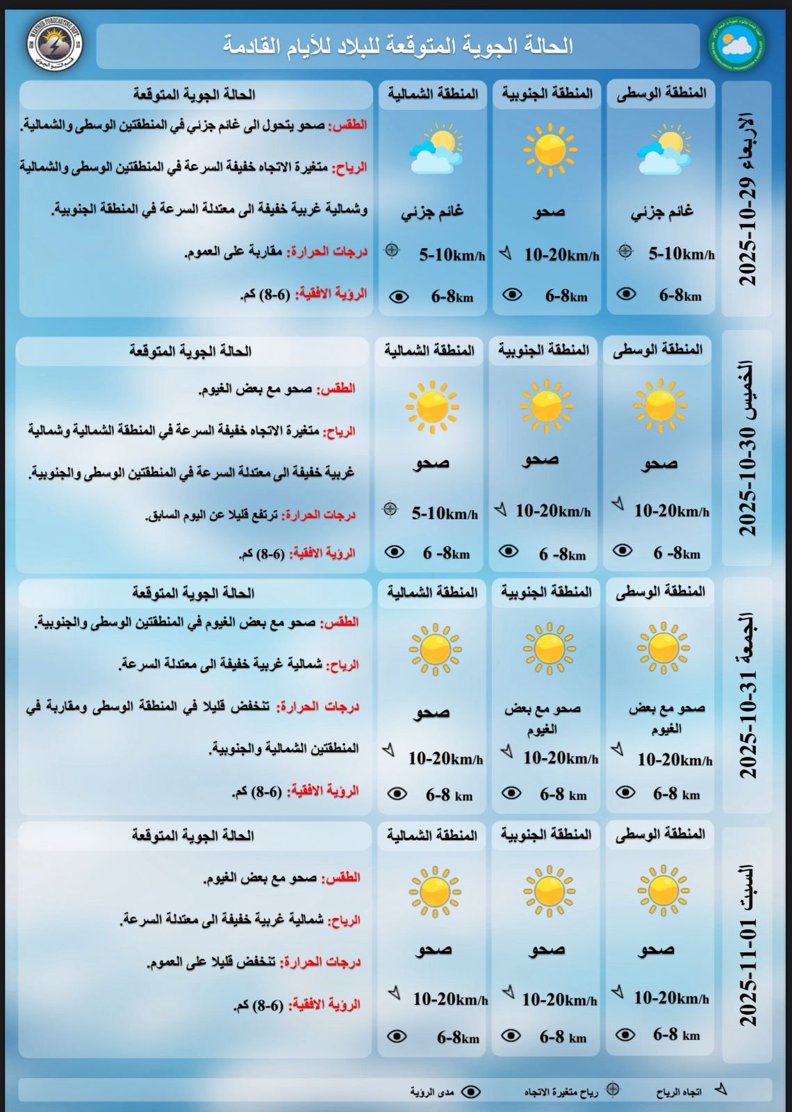 وقالت الهيئة في بيان إن "طقس يوم غد الأربعاء سيكون صحوا يتحول الى غائم جزئي في المنطقتين الوسطى والشمالية ودرجات الحرارة مقاربة لليوم السابق على العموم"،