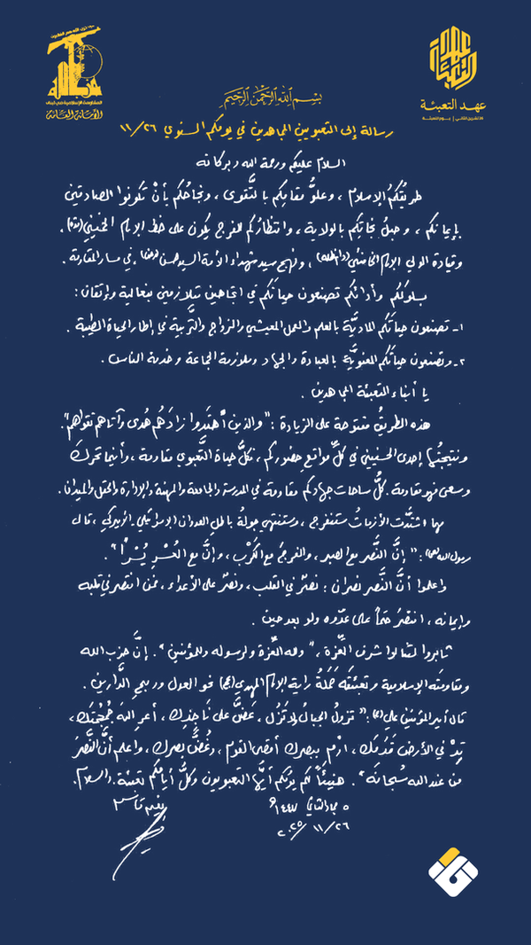 "إن علوُ مقامِكم بالتقوى، ونجاحكم بأن تكونوا الصادقين بإيمانكم، وحبل نجاتكم بالولاية، وانتظاركم الفرج يكون على خط الإمام الخميني (قدس سره)، وقيادة الولي الإمام الخامنئي (دام ظله)، ونهج سيد شهداء الأمة السيد حسن نصر الله (رضوان الله عليه)، في مسار المقاومة".