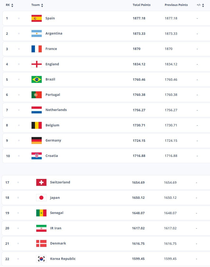 وتحتل إسبانيا والأرجنتين المركزين الأول والثاني في هذا التصنيف، كما كانا في الأشهر الأخيرة.