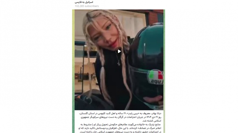 نبأ قناة إسرائيل بالفارسية على التليغرام عن مقتل بيبي رايدر