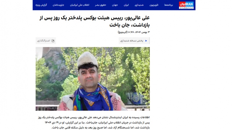 - في خبر آخر متعلق بمشروع صناعة القتل، أُعلن عن اعتقال "علي عالي بور"، رئيس مجلس الملاكمة في قضاء "بُل دُختر" بمحافظة لُرستان الإيرانية، خلال احتجاجات في التاسع من يناير/كانون الثاني، وتعذيبه حتى الموت.